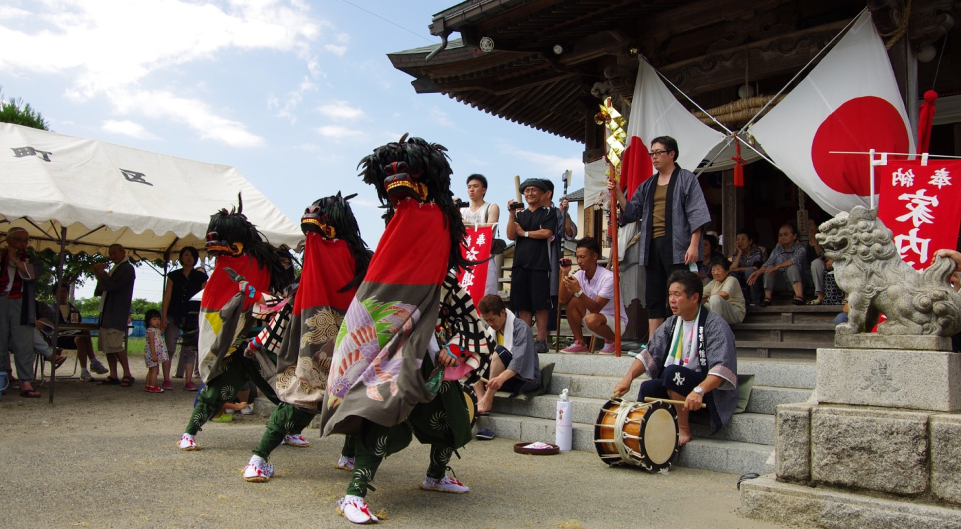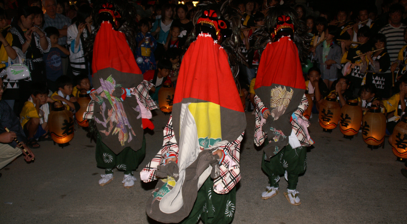 衣装・飾り | ・獅子は、前獅子(雄)、中獅子(雌)、後獅子(雄)という組み合わせ。 ・幕は、前獅子が鳳凰、中獅子が唐獅子牡丹、後獅子が鳥に松。 ・獅子頭は漆塗りの面に蜀鶏の毛。 ・棒押しの若衆はサラシを巻き、白ズボン。上半身は裸。 |