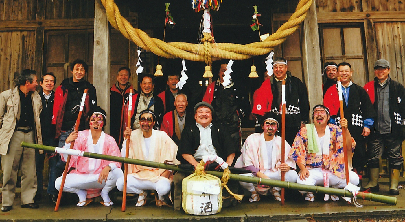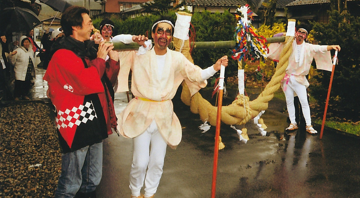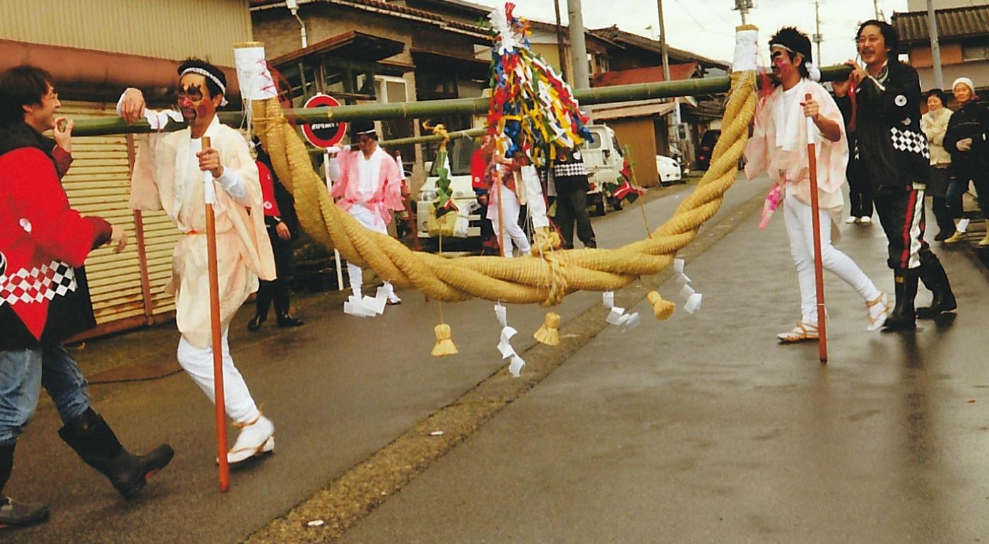おススメの見どころ | 色紙や水引で飾り付けた大きなしめ縄を青竹に括り付け、長持歌を唄いながら集落内を練り歩いて熊野神社に奉納します。既婚の男性二人が女性用の襦袢を身に着け、顔には墨や紅で奇抜な化粧をして担ぎ手となる、県北地方の「奇祭」です。 |