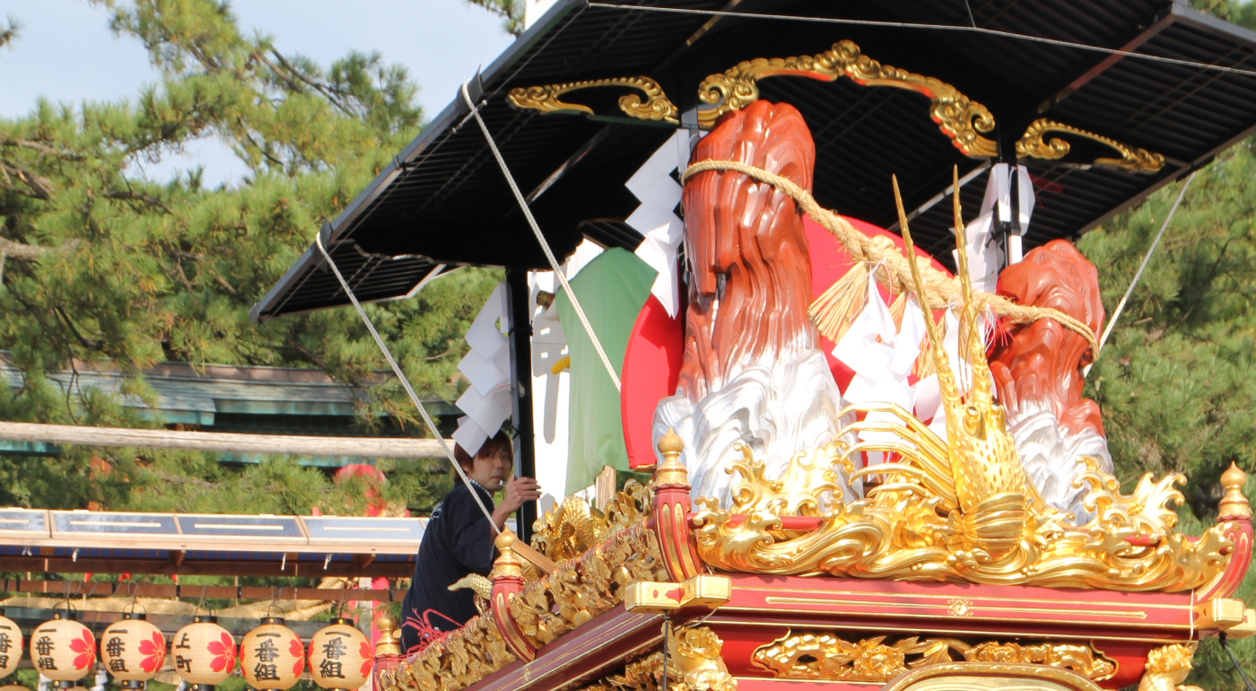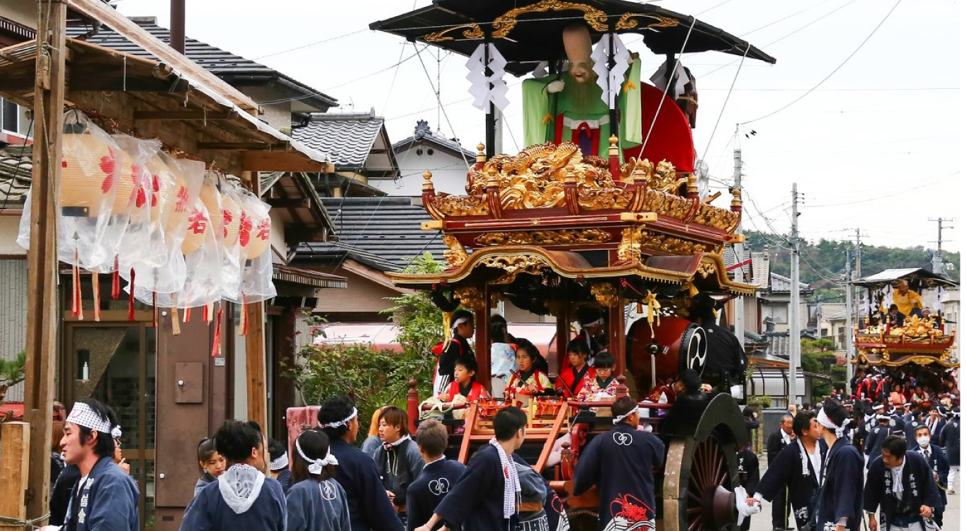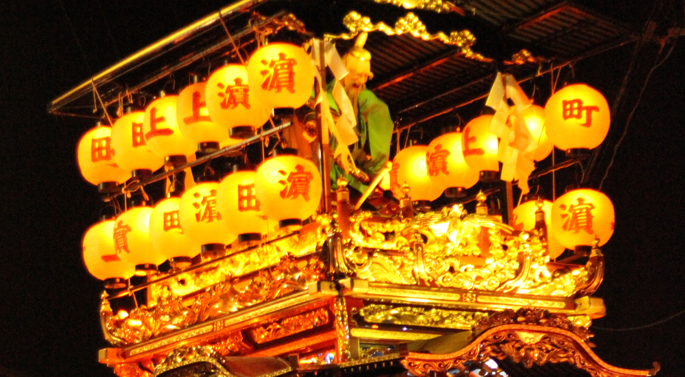 下大町の屋台は天保13(1842)年に製作され、布施平七の作と言われています。乗せ物は「福禄寿」、見送りは「二見ケ裏の日の出と海老」です。福禄寿を意味する「外法(げほう)様」と親しく呼ばれています。
