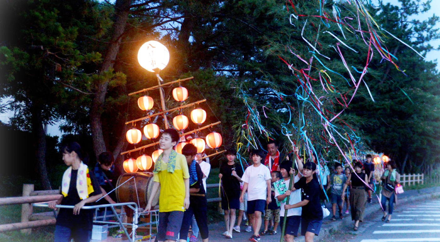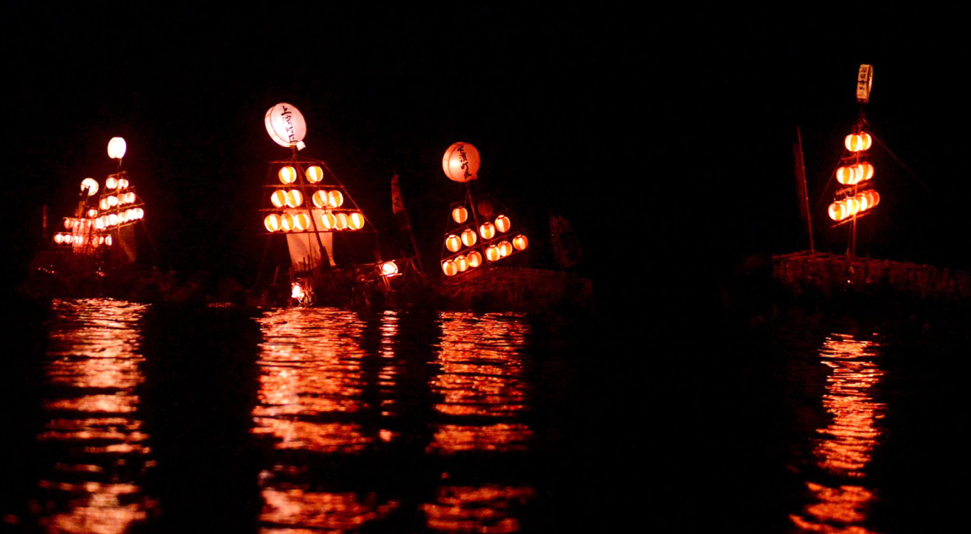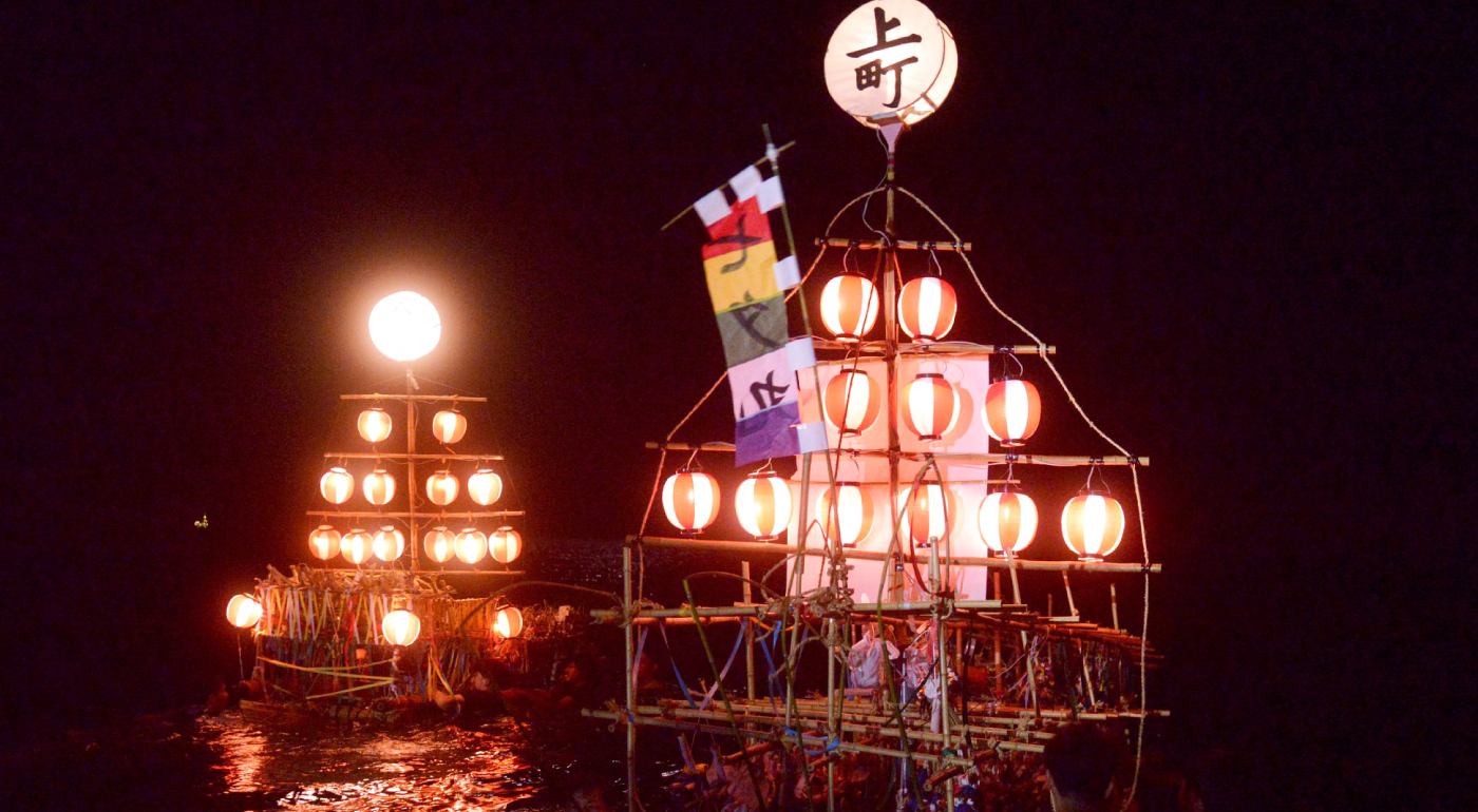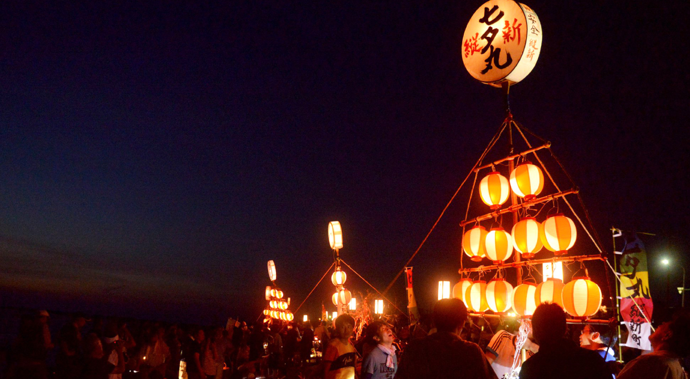 おススメの見どころ | お盆前の8月6日の夜、全長3m以上の茅作りの舟が、普段は海水浴客でにぎわう砂浜に集結します。夏の夕闇どきに、村上市岩船地区の各町内で作った七夕の舟が十二灯と呼ばれる提灯にほのかに照らされ浮かび上がる様は毎年の夏の風物詩になっています。子どもたちの「たーなばった―おっくれよ、じゅーにどーおっくれよ」という掛け声も祭りに色どりを与えています。 |