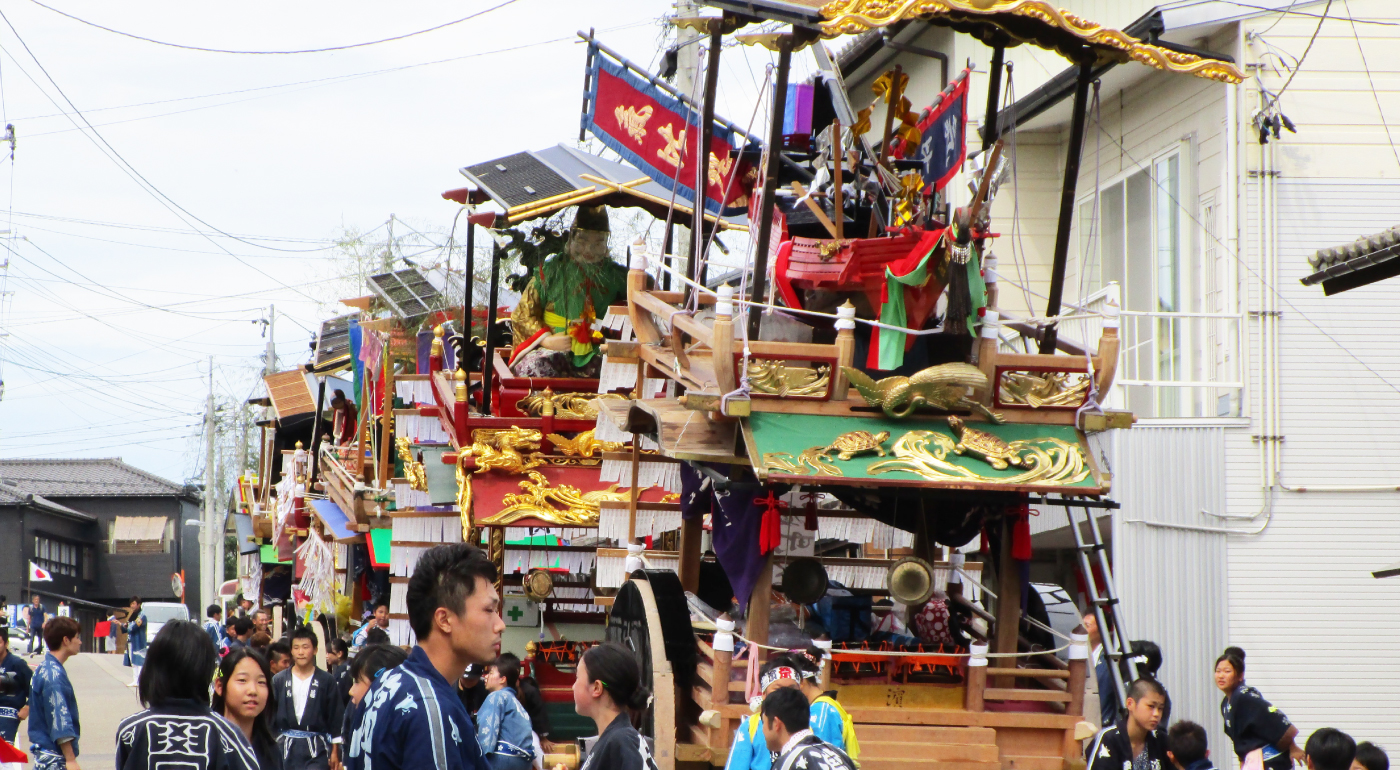 由来 | 瀬波大祭は、保食神を祭神とする西奈弥神社の例大祭。越前国敦賀(今の福井県)の気比神宮の祭神である気比大神の瀬波への来航上陸を祝うものであり、大祭では神霊をのせた御輿の後ろに、渡海船に擬せられた屋台を先頭にして、計5台の屋台行列が瀬波の町内を練り歩きます。 |
