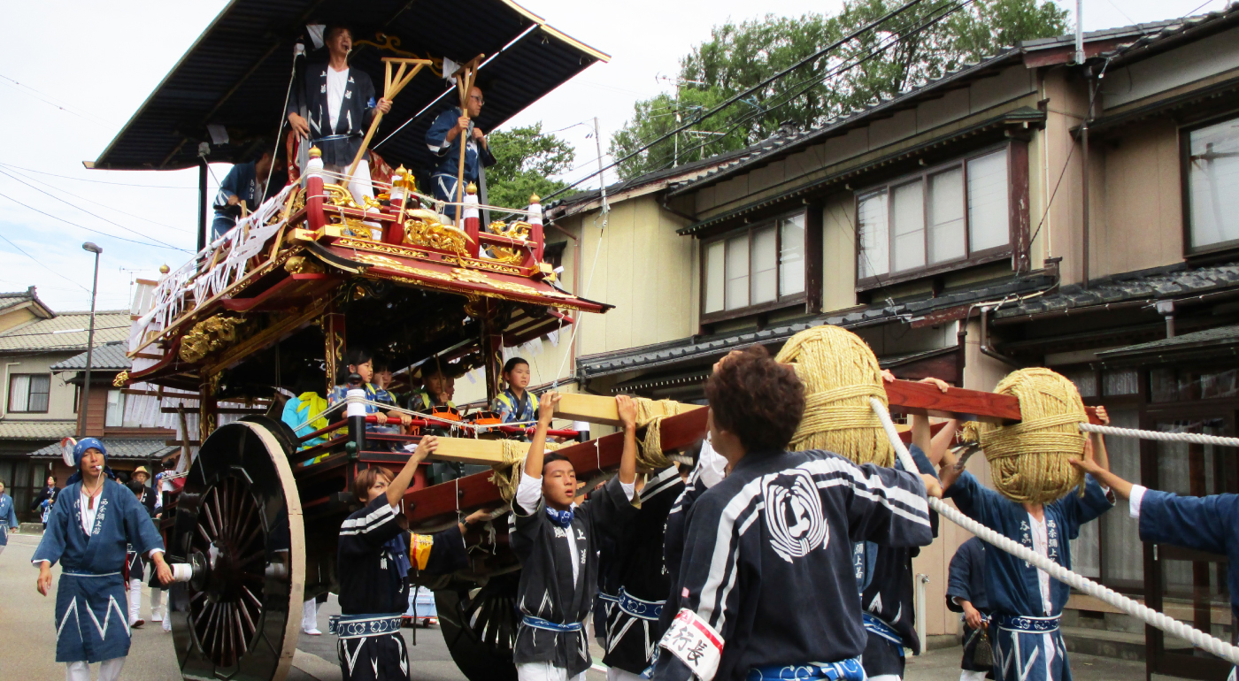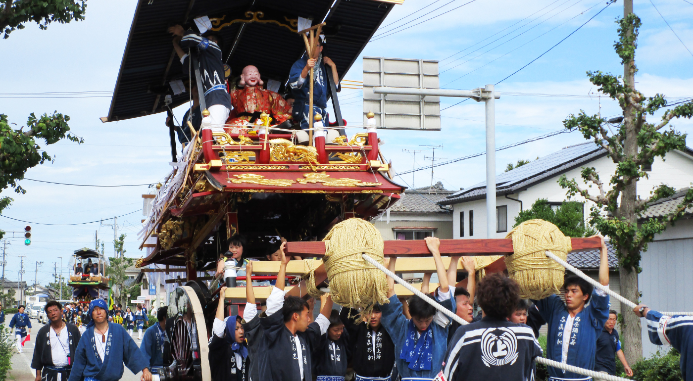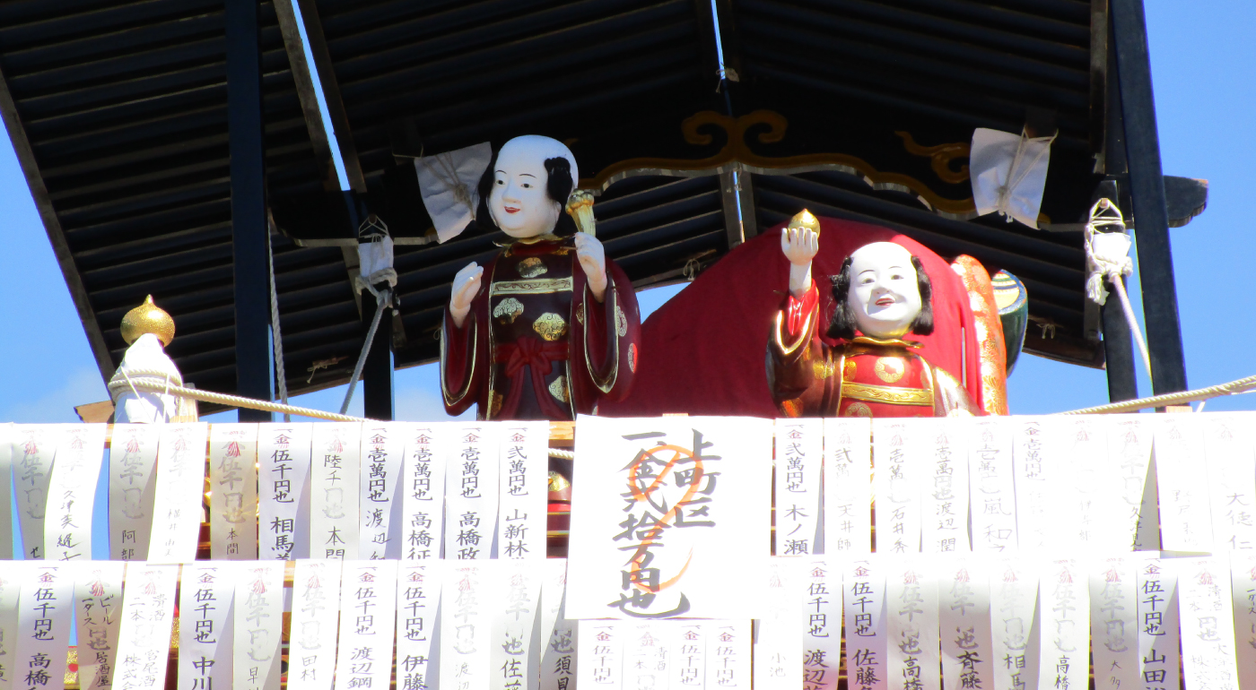 瀬波上町の屋台は、建造年代は不明だが、屋台道具収納箱に享保の年号の箱書が見られることから歴史の有る屋台であると考えられる。瀬波中町同様に全体に装飾彫刻を施した総漆塗りの華麗な屋台である。二階の乗せ物は、大黒天像であり、この像の後ろに二体の唐子を従えている。