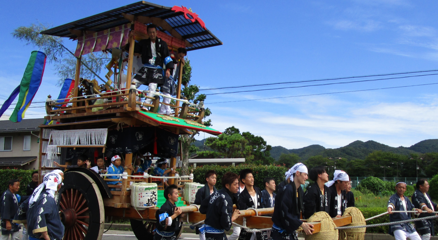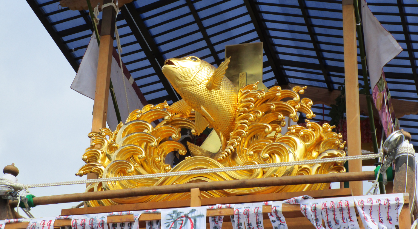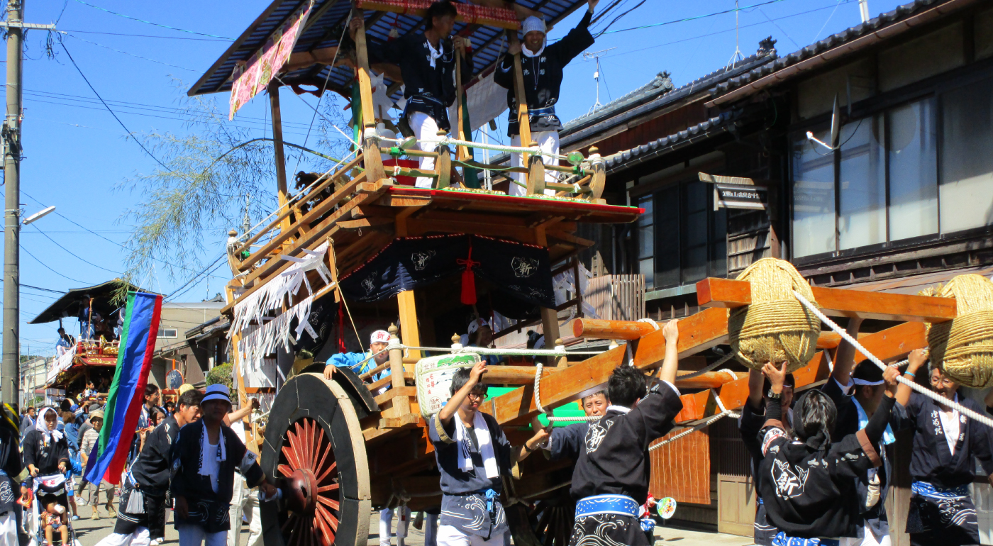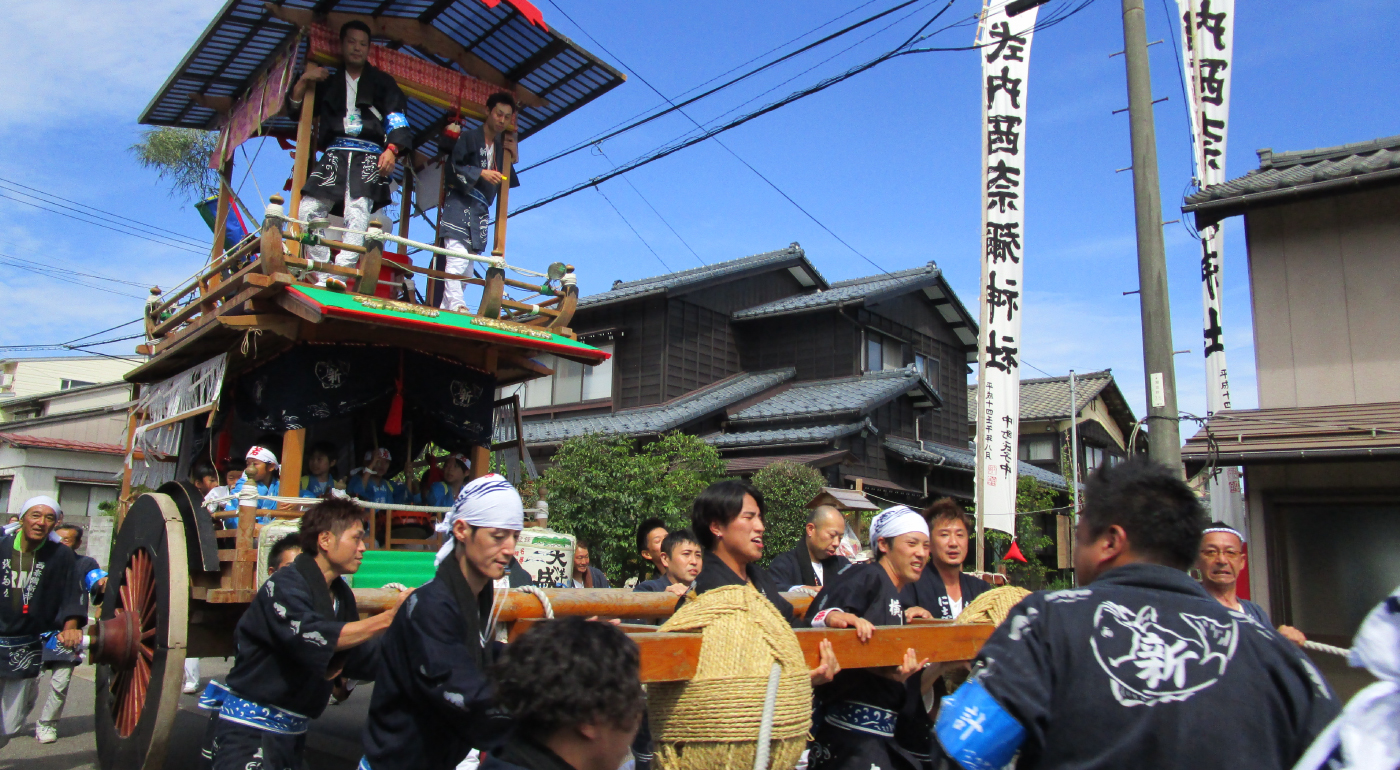 瀬波新田町の屋台は、瀬波浜町と同様に明治時代の火災により焼失しており、現在の屋台は、その後昭和24年(1949)に再建されたものである。瀬波浜町同様に白木造りで、二階の乗せ物は、大きな御神酒徳利であるが、昔は布袋像であったと言われている。