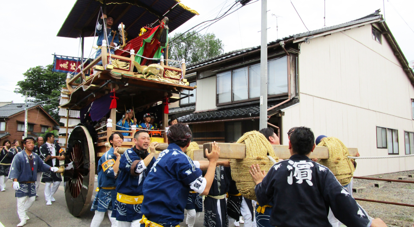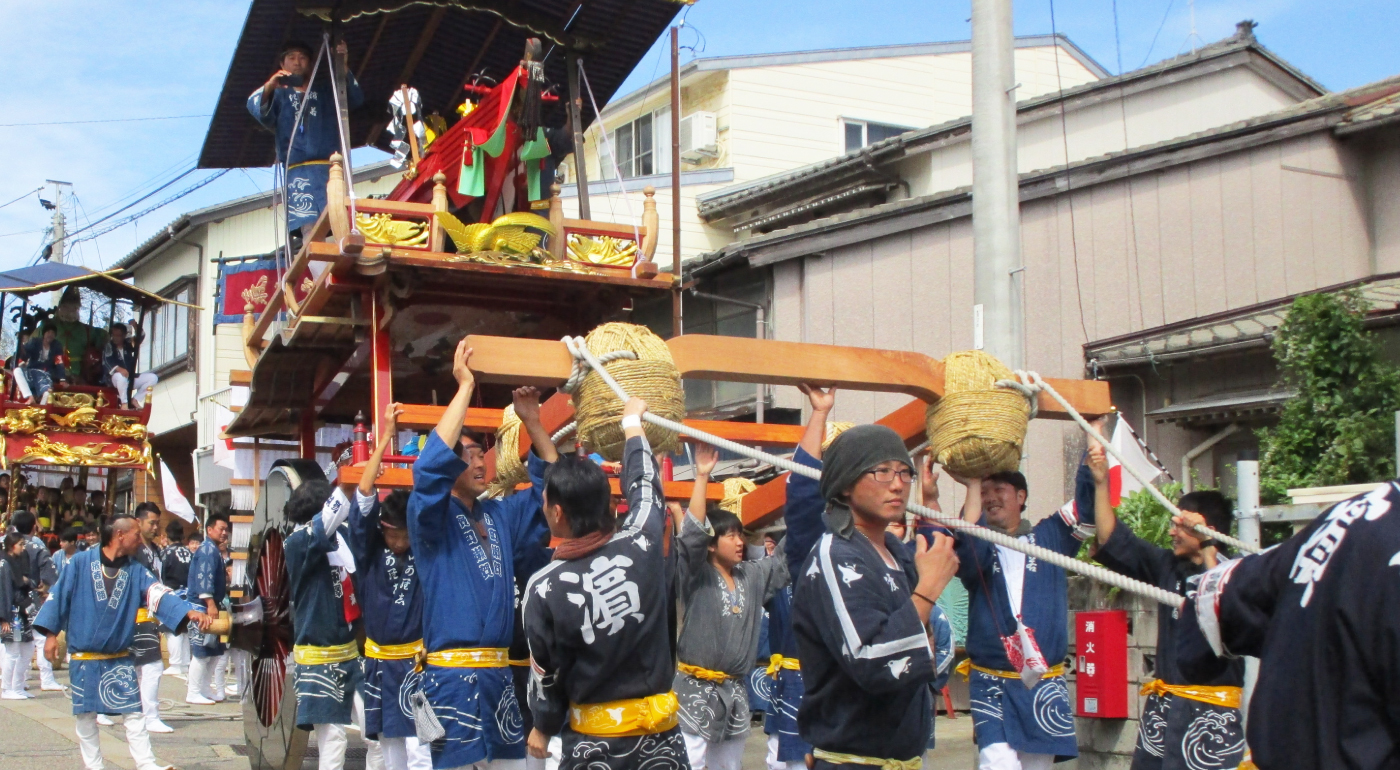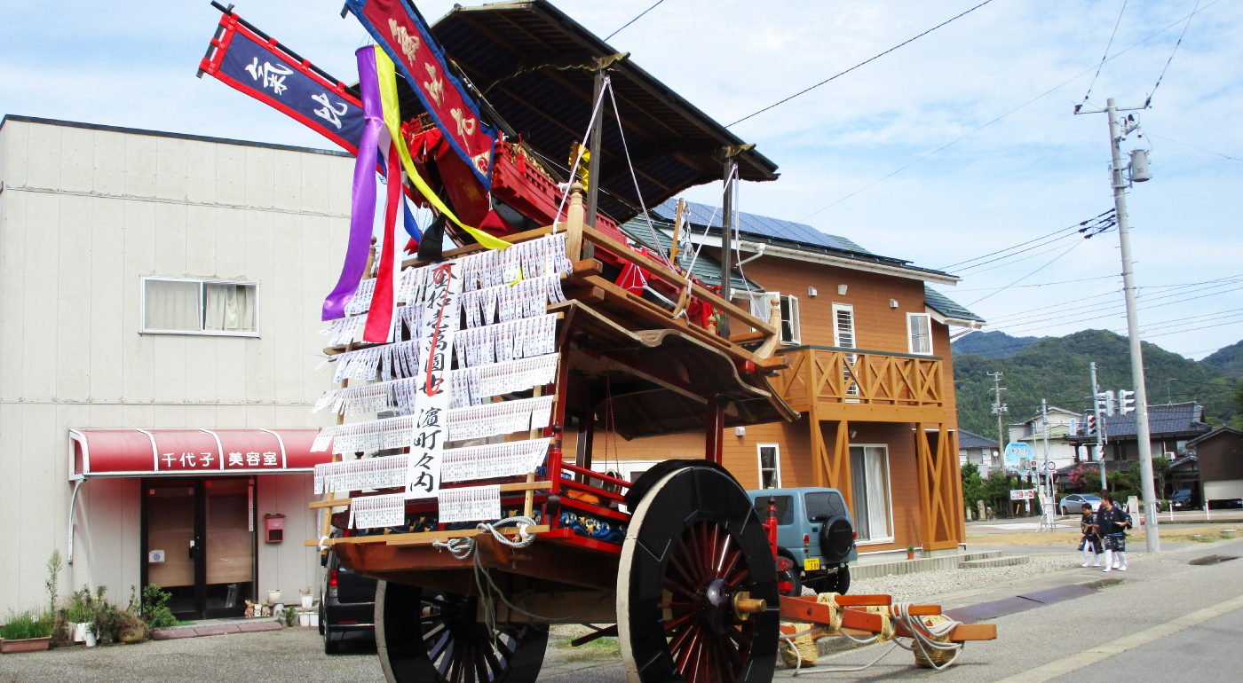 瀬波浜町の屋台は、明治18年(1885)火災に遭い、その後、再建された屋台である。このため、車輪を除いて漆は塗られておらず、白木の屋台であったが、近年復元修理が行われている。乗せ物は、「気比丸」と称する船で、瀬波の神様が上陸された際に乗ってこられた船を模したものと言われている。なお、この飾り物だけは、火災による焼失を免れ、その後の補修や手入れはあるものの、当初の様式をとどめている。
