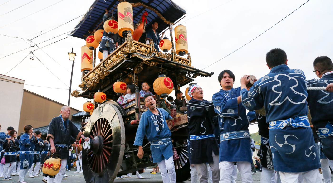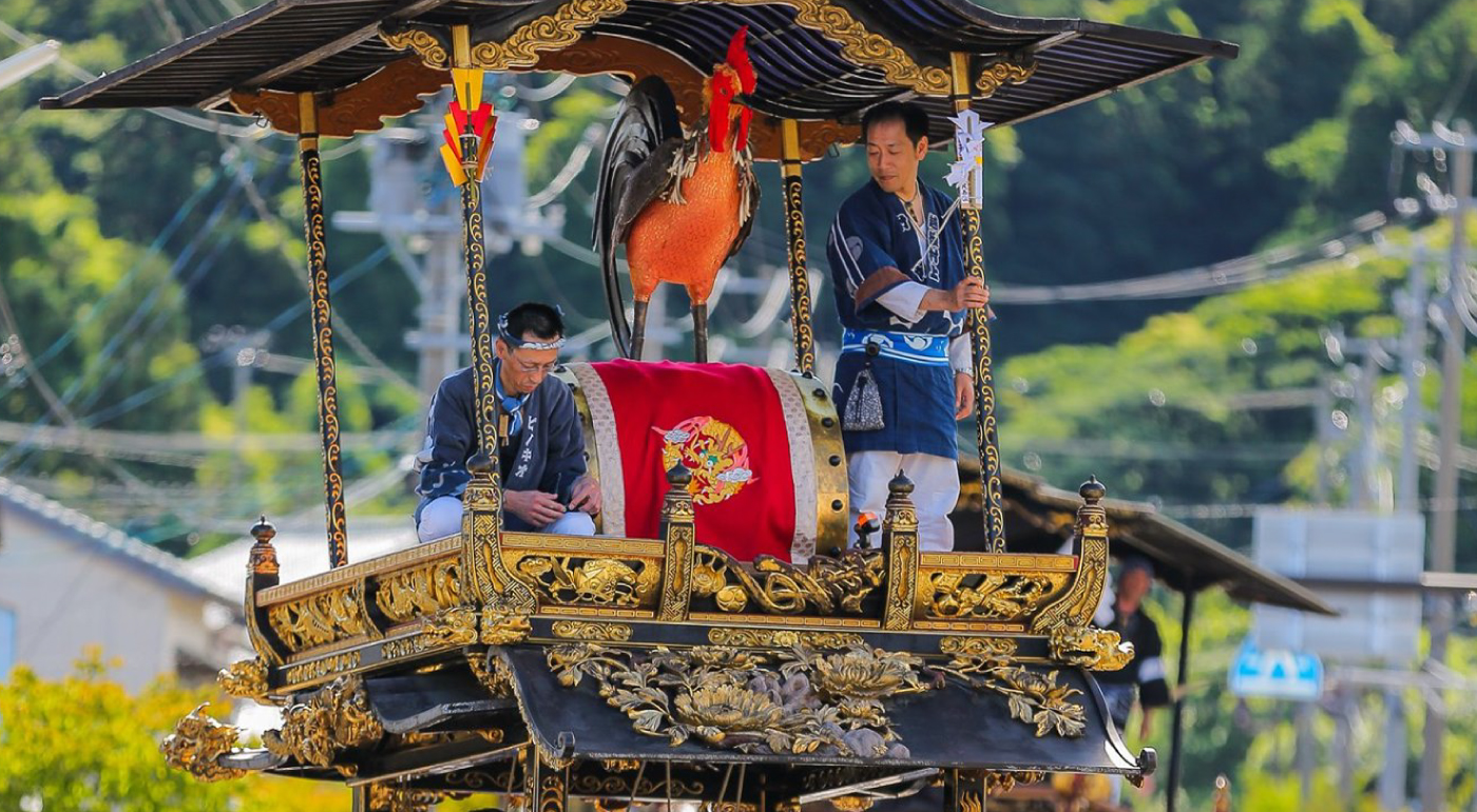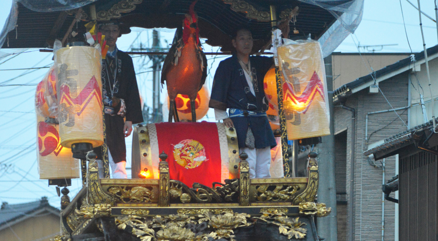 大町の屋台は、明治5(1872)年の大火で焼失後に再建されたもので彫刻は昭和9(1934)年に完成しました。乗せ物は「諫鼓(かんこ)に鶏」です。諫鼓とは、昔の中国で君主に諫言(かんげん)したい者に打たせた太鼓のことで、平和の象徴とされています。