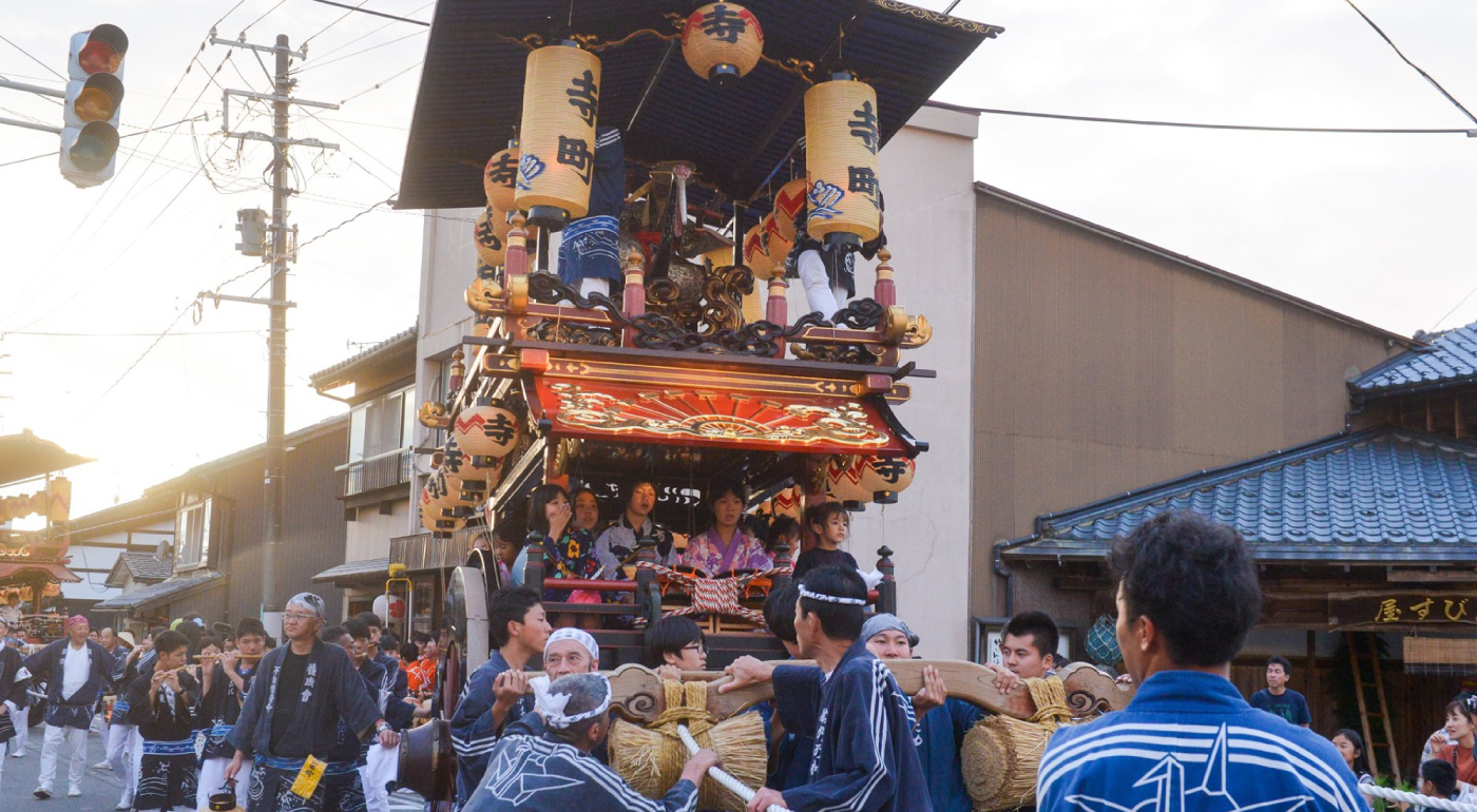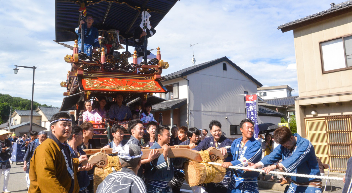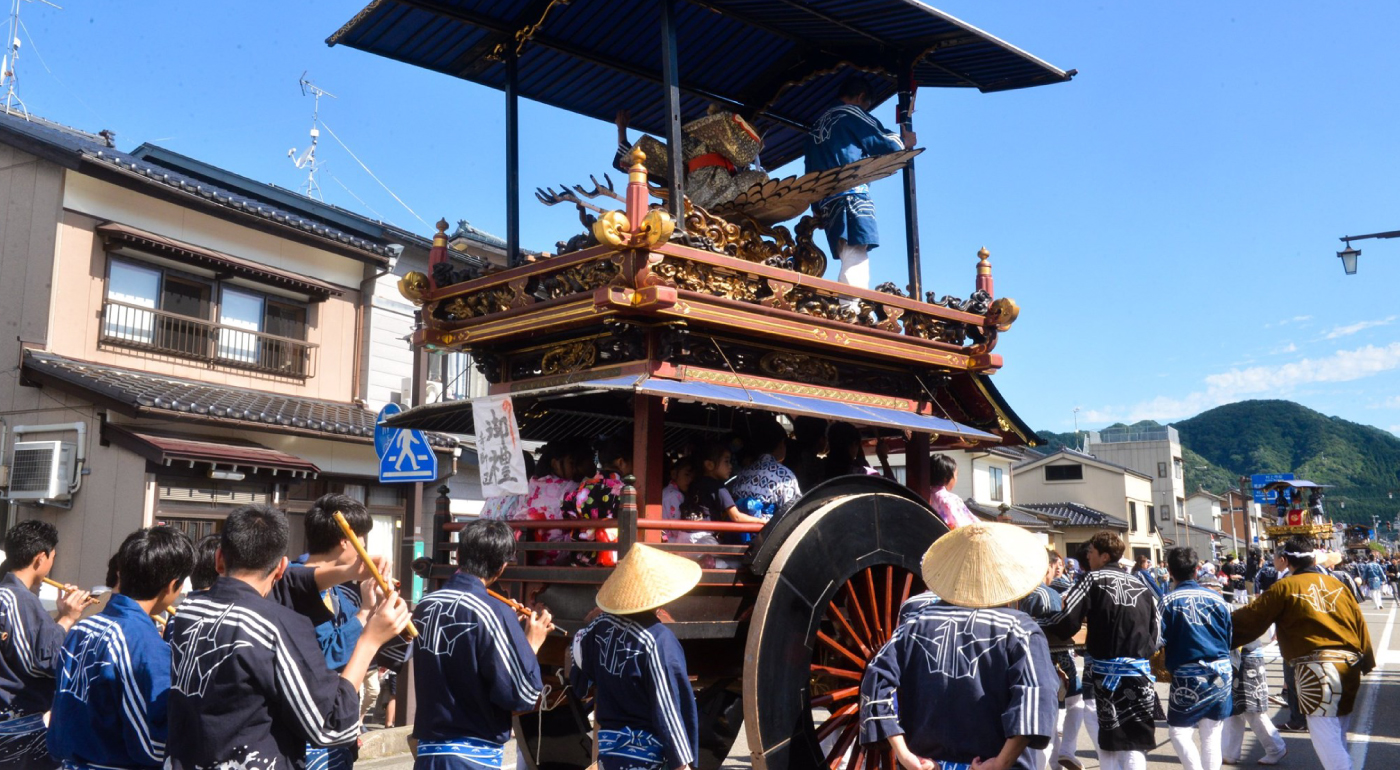 寺町の屋台は、寛政元(1789)年 に造られたものです。乗せ物は、昔の中国の道士「費長房」ですが、曽我兄弟の仇討を題材とした曽我物語に登場する「鶴に乗った仙人」としてなじみがあります。屋台を飾る彫り物は、二階高欄(こうらん)の彫り物には、カブにネズミ、竹に虎、波に兎、欄干の龍など十二支にちなんだものが配され、一階登り高欄の浪彫り、前庇の槌車など、その当時における村上城下の名のある工匠の作と伝えられています。