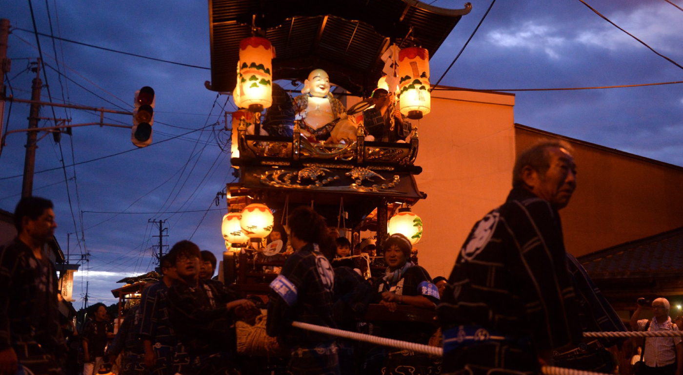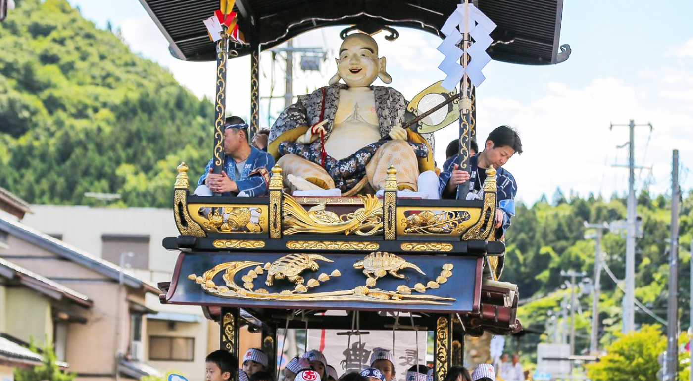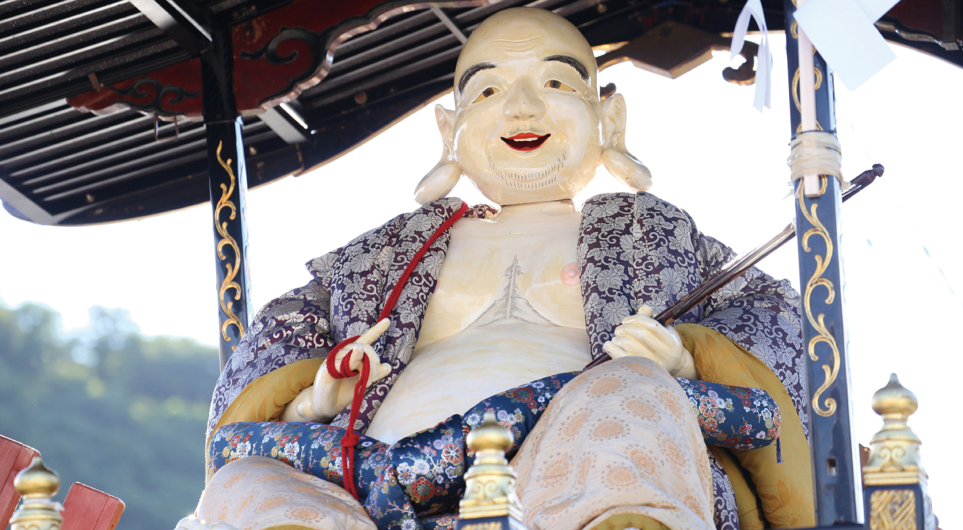 長井町の屋台は、明治2年(1869)に造り替えられたものです。乗せ物は、前の屋台から引き継いだ布袋様で、京都で造られました。布袋様は、中国の禅僧「布袋和尚」を起源として、江戸時代には七福神の一つに数えられるようになりました。長井町の乗せ物「布袋様」は、村上の屋台の乗せ物の中では唯一のカラクリ人形で、顔を左右に振ったり、舌を出す様子などに愛嬌があります。