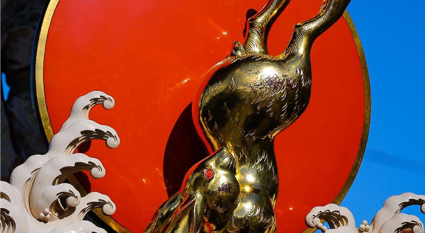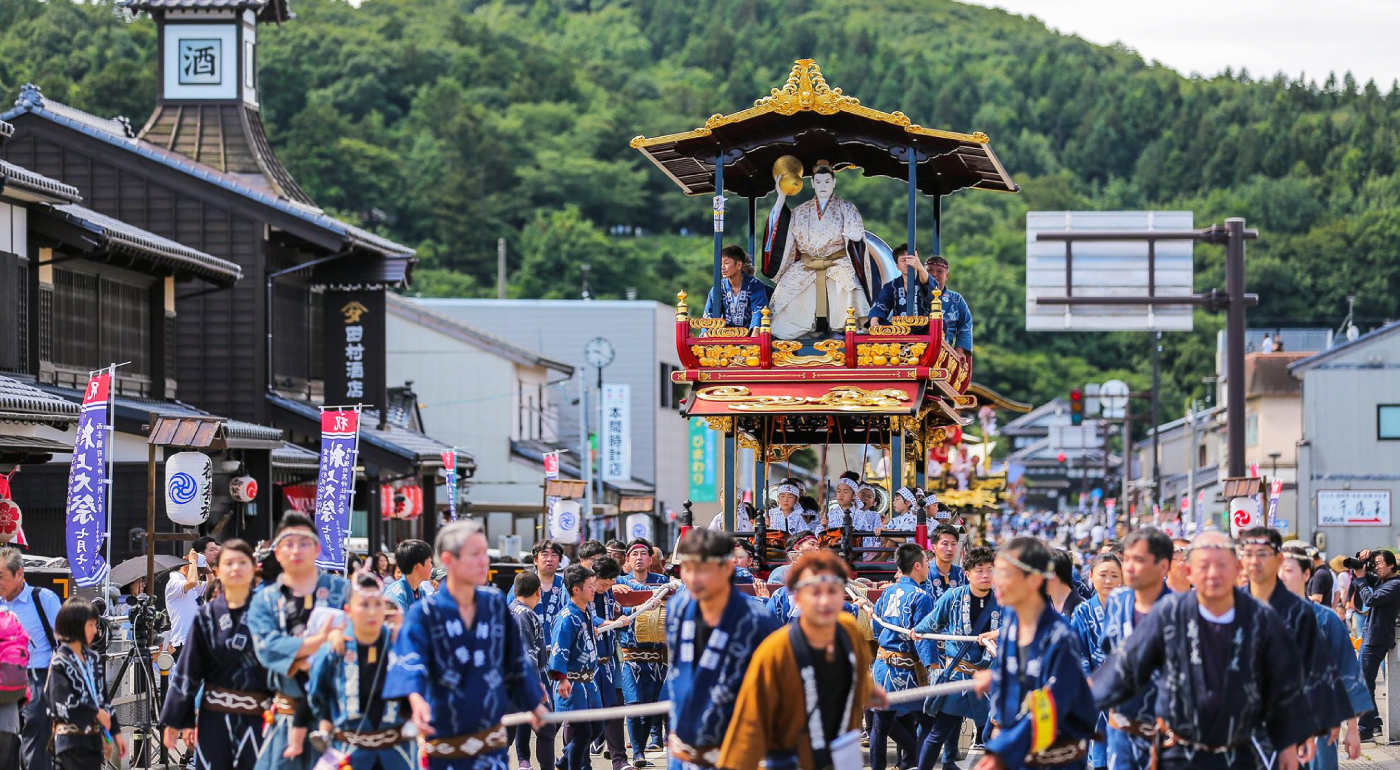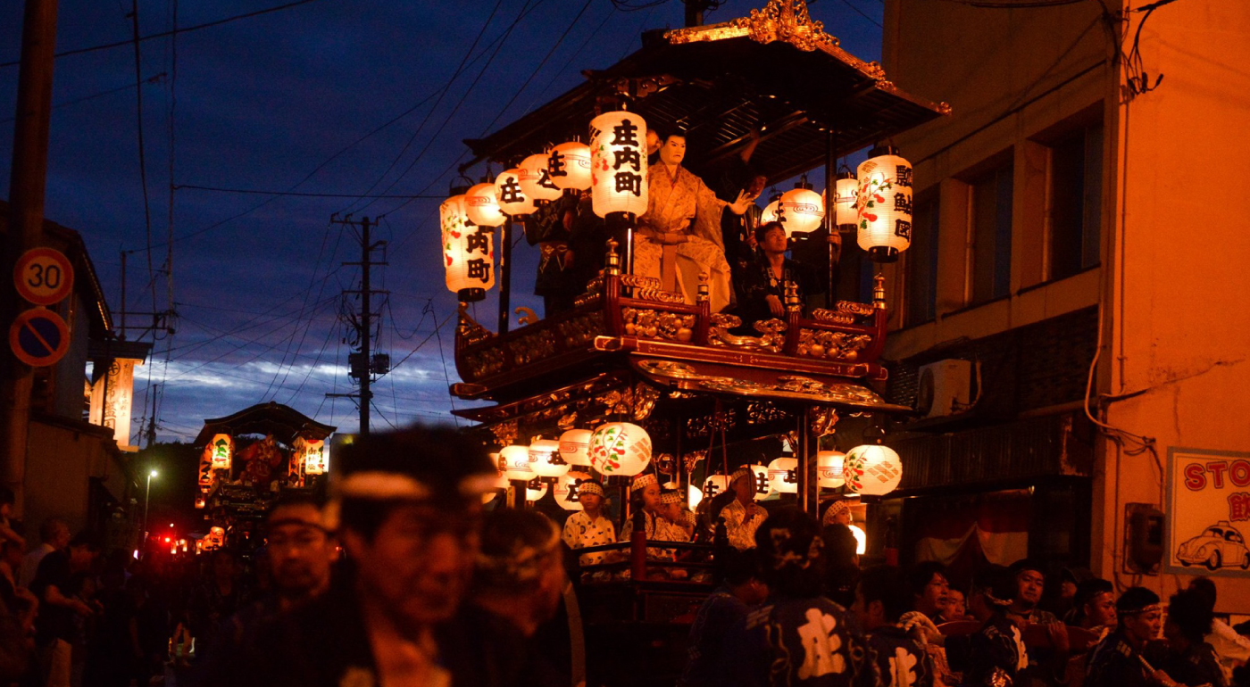 庄内町はしゃぎり屋台。乗せ物は、「瓢鮎図(ひょうねんず)」です。平成14(2002)年に新調されたもので、一般的には瓢箪鯰(ひょうたんなまず)として地震の鎮圧で広く知られる題材ですが、「不可能に可能を探る」という意味があり、人生の困難を切り開こうとする姿が表現されています。見送りは波うさぎ。うさぎの背景は日中は太陽ですが、夜になると三日月に変わる仕掛けになっています。平成7(1995)年ににわか屋台を再建。平成11(1999)年にしゃぎり屋台に改装されました。