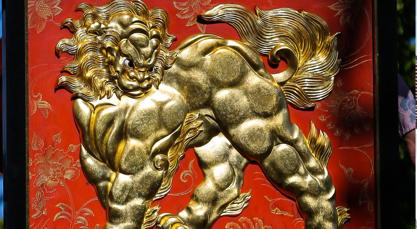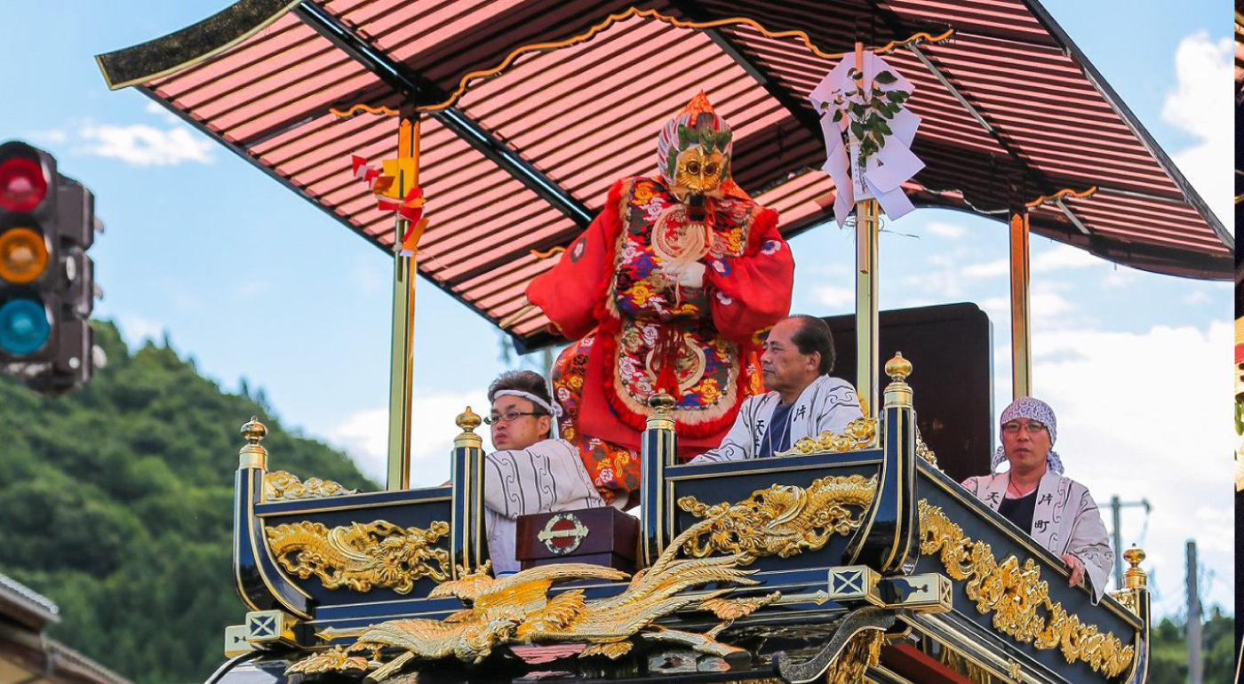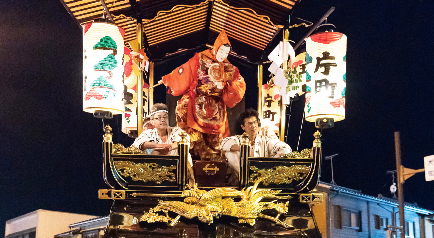 片町の屋台は昭和8(1933)年に造られたもので、平成20(2008)年に造り替えられました。しゃぎり屋台の形式でありながら、調べはお囃子調子で、乗り子の衣裳は舞楽の楽士の衣裳であるところが特徴的です。乗せ物は、舞楽の「蘭陵王(らんりょうおう)」。屋台後方の見送りは、壮大な唐獅子で、当時の帝展無鑑査の美術作家、初代・小野為郎と山脇敏男の合作によるものです。