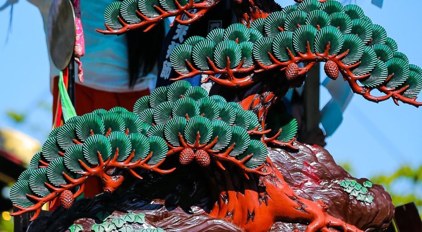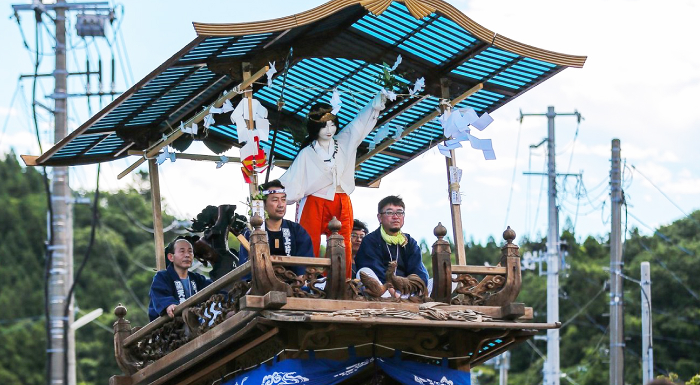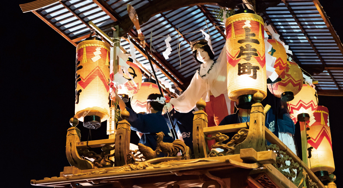 上片町の屋台は、昭和9(1934)年に造られたものです。乗せ物は神代を象徴する岩戸神楽の「天鈿女命(あめのうずめのみこと)」で、山脇敏男の作です。お囃子は、岩船の横新町より取り入れられ、乗り子は水色の帷子と黄色の裃を着て、大太鼓、小太鼓、摺り鉦、そして笛の音で荘重の中に優美な調子を奏でます。平成12(2000)年、屋台後方の見送りが新調され、上片町の屋台に新たな1ぺージが加えられました。