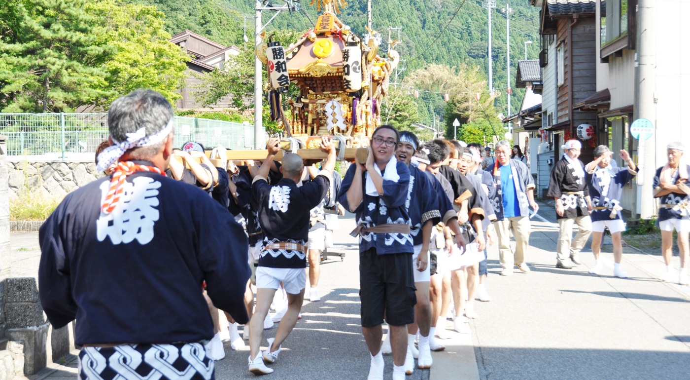 おススメの見どころ | 山北地区最大の祭りで、御神輿巡行、奉納花火、奉納相撲、稚児舞などが行われる。 9月15日直前の土日の行事予定(例年同じとは限らない) 【土曜日】 13:00 小学生ダンスパレード 14:30 勝和会「神社神輿」巡行 15:30 子ども神輿 19:30 奉納花火大会 【日曜日】 9:00 宮のぼり 10:00 大祭(稚児舞、神楽) 10:00 山北地区体育協会相撲大会 11:30 八幡山土俵入り 12:30 新潟・山形二県対抗奉納相撲大会 |